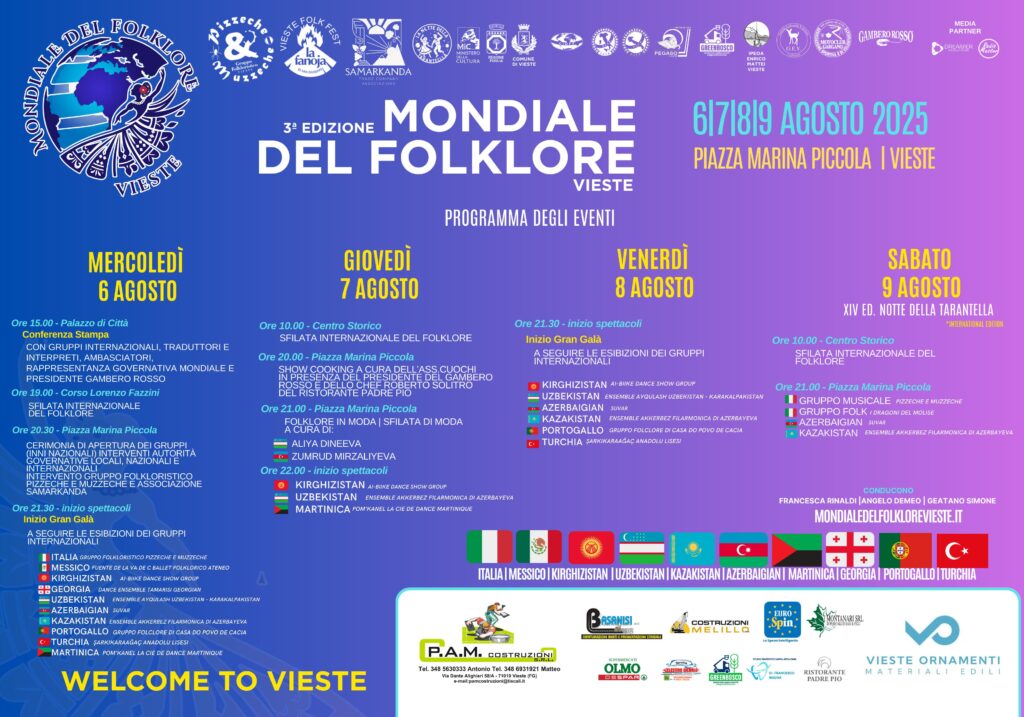 Per quattro serate consecutive Marina Piccola di Vieste diventerà un grande anfiteatro a cielo aperto in cui ritmi ancestrali, abiti d’epoca e coreografie spettacolari si fonderanno con il profumo del mare. Dal 6 al 9 agosto gruppi folk provenienti da ogni latitudine racconteranno, con musica e danza, le storie e le leggende dei rispettivi Paesi: un mosaico culturale che invita al dialogo e alla meraviglia. La manifestazione, promossa dal Comune di Vieste con la direzione artistica del Gruppo Folkloristico “Pizzeche e Muzzeche” e la co-organizzazione dell’Associazione Samarkanda, ospiterà delegazioni provenienti da nove Paesi di quattro continenti – tra cui Messico, Kirghizistan, Honduras e Martinica – confermando il ruolo di Vieste quale crocevia internazionale delle culture popolari.